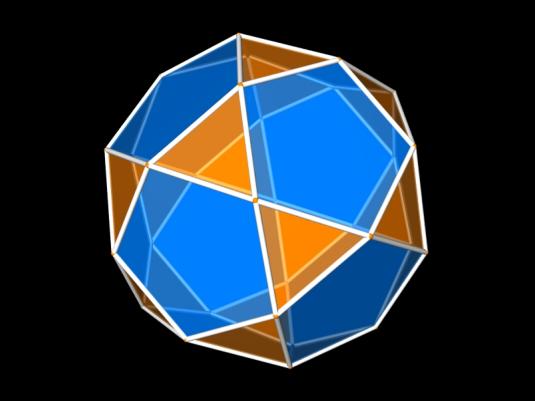 Transformation between an icosahedron and a dual dodecahedron by truncating to the mid-points of the edges and then switching models.