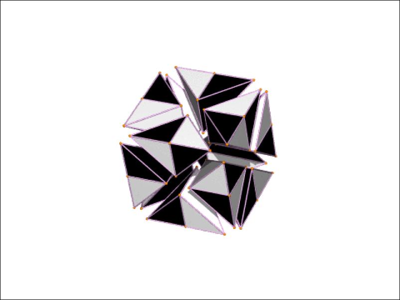 A cube is rearranged into a stellation of the rhombic dodecahedron. The tetrahedra overlap.