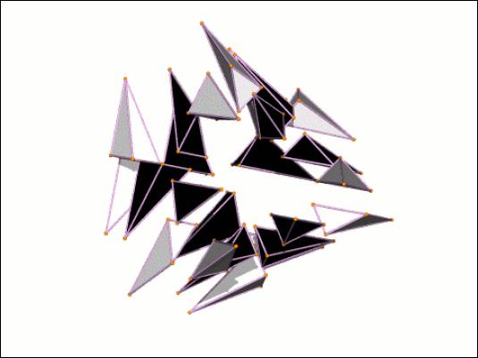 White tetrahedra are rotated about axes through the edge centres. Black tetrahedra are rotated about axes through the face centres.
