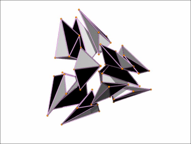 A tetrahedron is rearranged into its dual. The rotation axes are half way along the line joining a face centre to a vertex.
