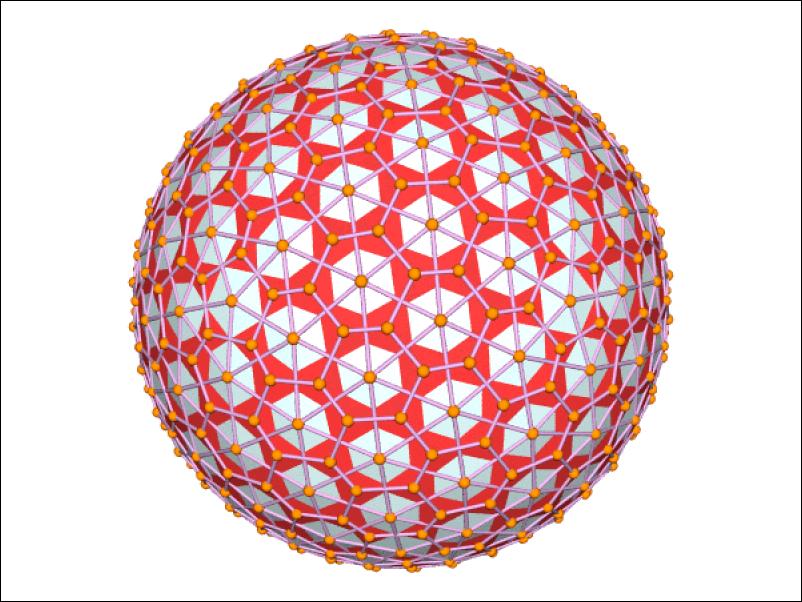 Class III 2,3 icosahedral geodesic sphere (blue faces) paired with a dual (red faces) which intersects the furthest edges.