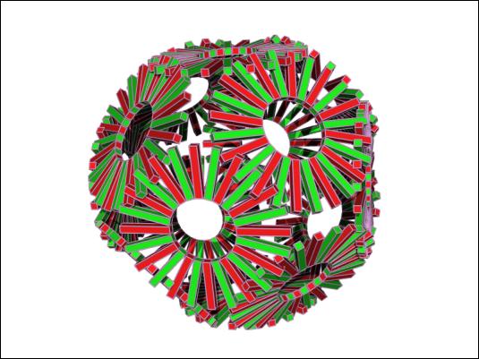 Cogs aligned with the faces of a cuboctahedron and with their centres lying on a sphere.