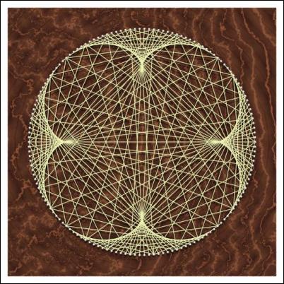 Description : The curve is the path followed by a point on the circumference of a circle of radius one unit as it rolls around the circumference of a circle of radius four units. It is formed here from its tangents by laying N points equally on a circle, and joining point n to the point (5n + N/2) mod N.