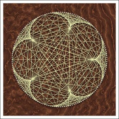 Description : The curve is the path followed by a point on the circumference of a circle of radius one unit as it rolls around the circumference of a circle of radius five units. It is formed here from its tangents by laying N points equally on a circle, and joining point n to the point (6n + N/2) mod N.