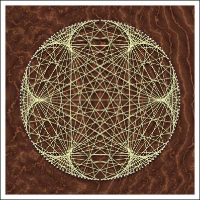 Description : The curve is the path followed by a point on the circumference of a circle of radius one unit as it rolls around the circumference of a circle of radius six units. It is formed here from its tangents by laying N points equally on a circle, and joining point n to the point (7n + N/2) mod N.