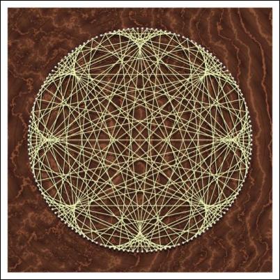 Description : The curve is the path followed by a point on the circumference of a circle of radius one unit as it rolls around the circumference of a circle of radius eight units. It is formed here from its tangents by laying N points equally on a circle, and joining point n to the point (9n + N/2) mod N.