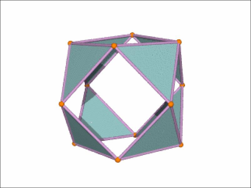Description : Jitterbug-like transformation of a single cuboctahedron to an octahedron, showing the triangular faces. The containing cube is a constant size.