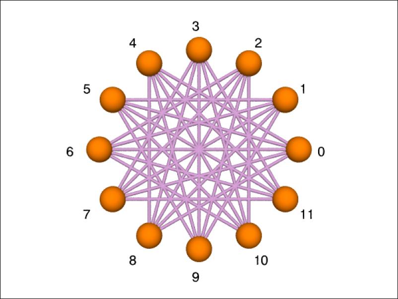 Circle of 12 points each connecting a series of 3 balls starting 4 balls later (each ball has 5 connections).