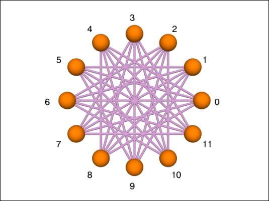 Circle of 12 points each connecting a series of 3 balls starting 4 balls later (each ball has 5 connections).