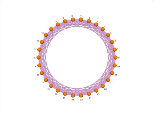 Circle of 30 points each connecting to series of 6 balls starting 1 ball later (each ball has 12 connections).