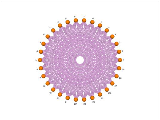Circle of 30 points each connecting to series of 6 balls starting 8 balls later (each ball has 12 connections).