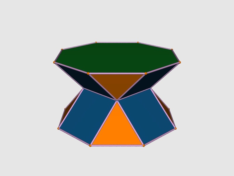 Description : The -F option aligns a face on the brick with a face on the base and then uses it to augment or excavate the base model (the polyhedra are joined and the bonding faces removed) It may be possible to align the face in various ways, the third number selects from these possibilities, with the first possibility being 0. In this example the upper polygon of a square cupola is bonded with itself. The base is read from standard input, the brick is specied as a copy of the base by not providing a name for it.