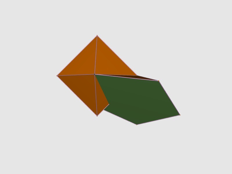 Description : The -v option with four numbers matches two vertices on the brick (second set of two index numbers) with two on the base (first set of two index numbers) by a translation to align the first pair of vertices, then a rotation to align the second pair. In this example a pentagonal pyramid has a slanting edge aligned with a slanting edge on a squre pyramid, but in the opposit direction.
