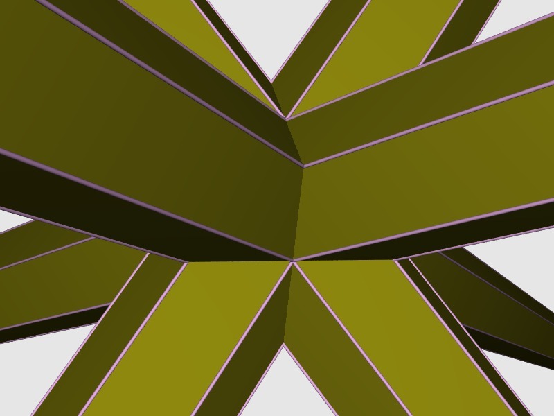 Description : Make the dual of a polyhedron with faces going through the reciprocation centre. The face becomes an ideal vertex 'at infinity'. The default display shows that the vertex can lie either side of the original face by connecting to it in both directions. This is simulated with two vertices and the model is not a topological dual, it is for display purposes only. It is not possible to place vertices at infinity, so a distance is used that helps with display. This distance can be overriden with option -I. The example shows the dual of an octahemioctahedron, with the 'infinity' distance set to 100000, which helps draw the ray-traced image correctly but is not needed for display with antiview.