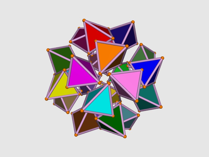 Description : The basic operation is to expand a model kaleidoscopically, according to some symmetry group. The components can be coloured individually. In this example a tetrahedron is offset and rotated, and in this position is repeated to create a model with octahedral rotational symmetry. Each component has its faces coloured with a diferent colour using the colour map compound. Any colour map can be used, but this map produces a reasonable spread of colours. If no element types (from v, e and f) are specified all the elements will be coloured using the map. To colour by index number use the remap map.