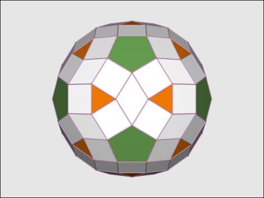Description : Zonohedrify a seed with the vertex vectors from another model. The vertex vectors of an icosahedron are used to add zones to an icosidodecahedron, and the zones are coloured white. The two base models have unit edges, so the vertices of the icoshedron are not unit, but can be set to unit with option -u