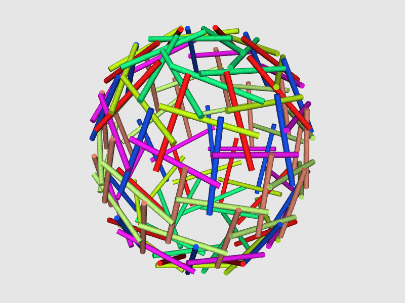 Description : Nexorade of polar zonohedron of 8 vectors with strut display, rendered with POV-Ray using nexorade.inc. The flat-ended elements cannot be viewed in antiview, but the POV-Ray file can be created with the following command...