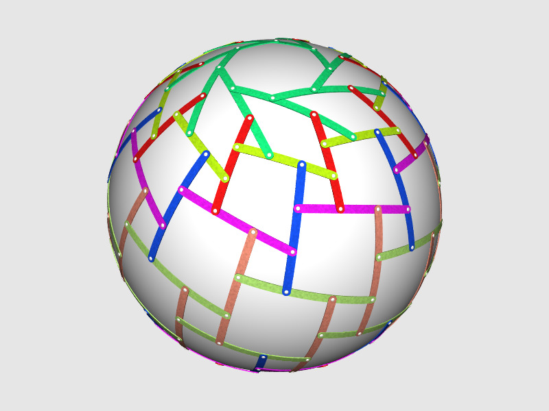 Rotegrity of polar zonohedron of 6 vectors with strap display, rendered in POV-Ray using