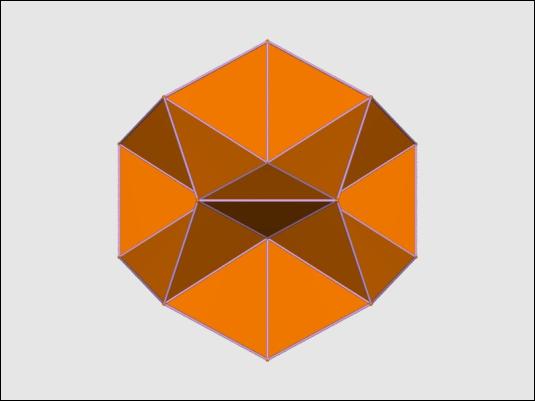 In this example the base polygon of a pentagonal pyramid is aligned with a face of a dodecahedron. An alignment number is chosen that causes the pyramid to lie inside the dodecahedron, producing an excavation. The bonding operation is repeated with the symmetry of the base model by specifying -y full.