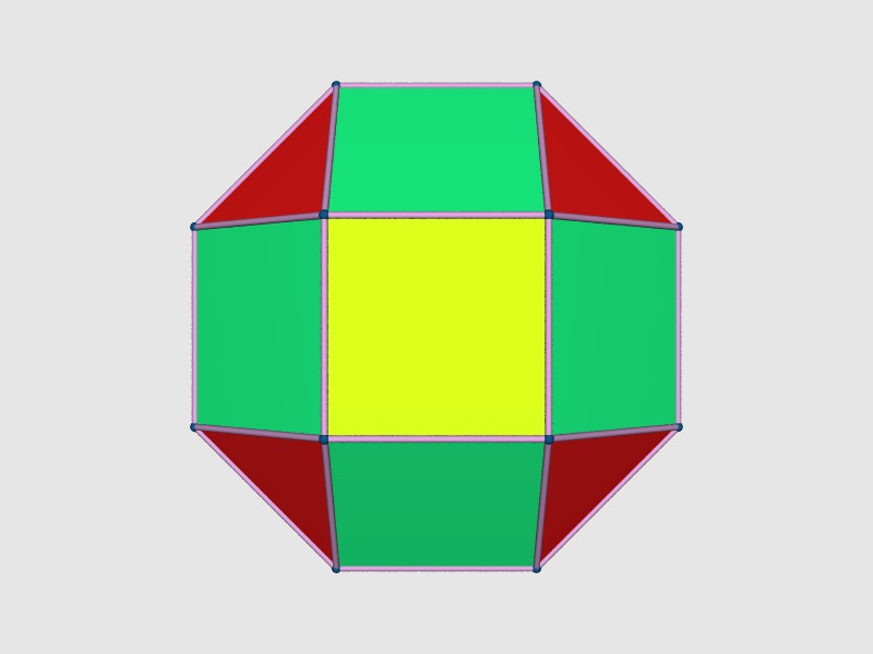 In this example, the square faces of the rhombicuboctahedron fall into two orbits under the full symmetry of the model (faces on 4-fold axes and faces on 2-fold axes). The following command assigns different colours to the different kinds of face.