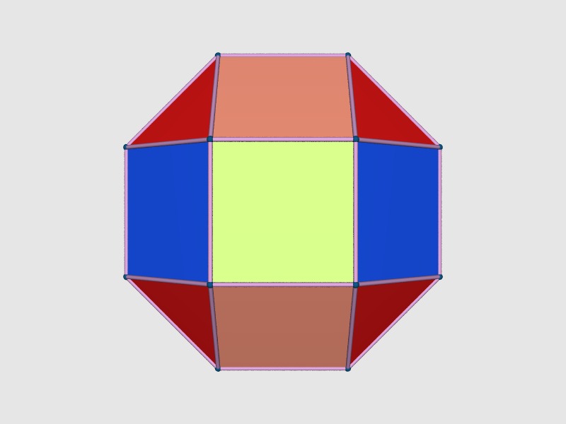 In this example, the square faces of the rhombicuboctahedron fall into six orbits under the default D2h sub-symmetry of the model. The following command assigns different colours to the different kinds of face.